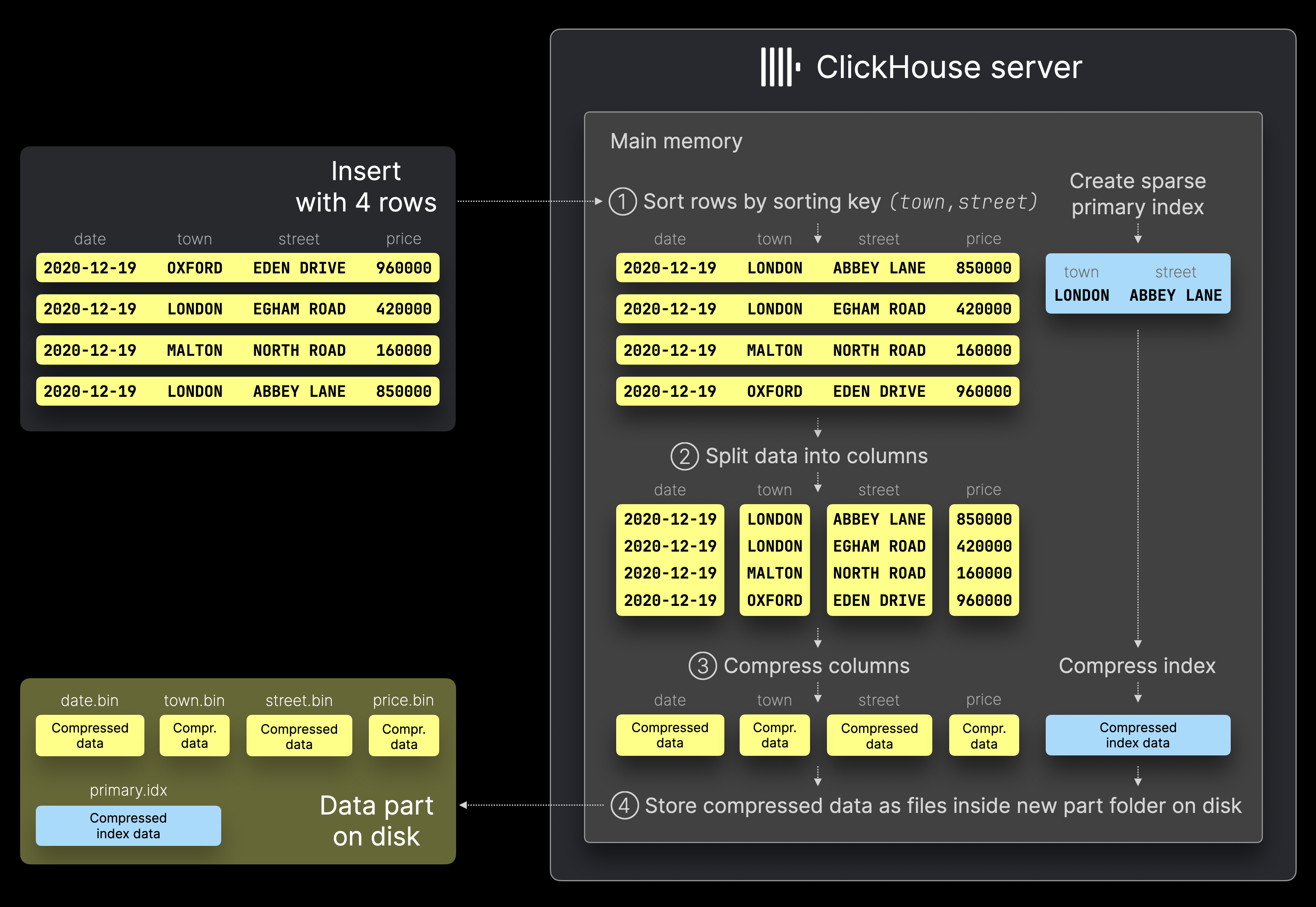 Когда сервер ClickHouse обрабатывает пример вставки с 4 строками (например, через оператор INSERT INTO), показанный на диаграмме выше, он выполняет несколько шагов: